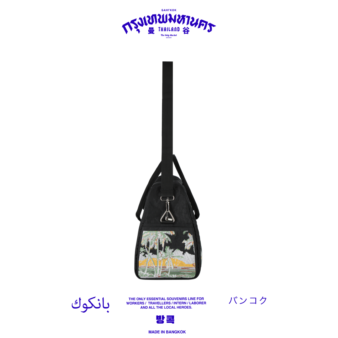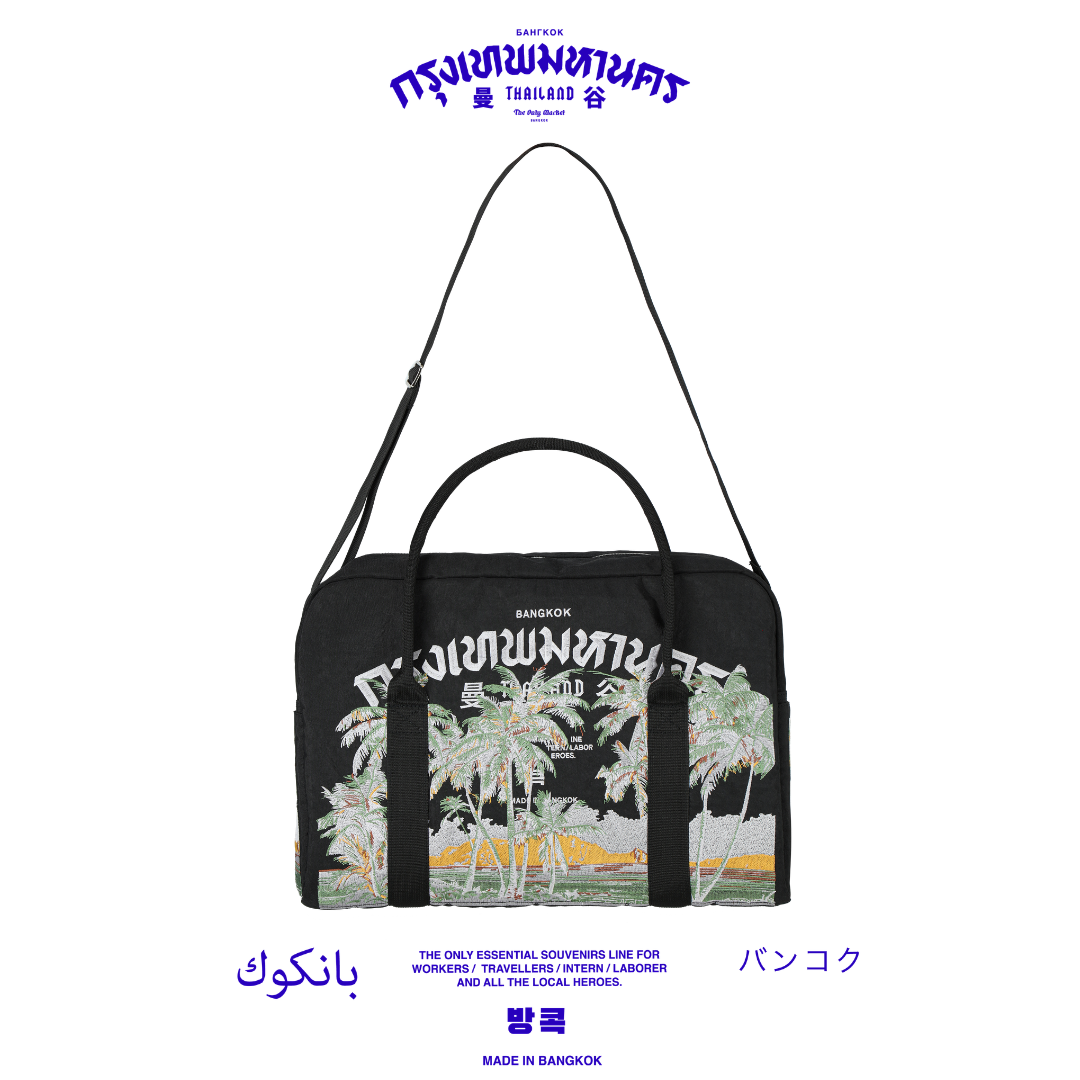 The Overnight Bag features a clean, understated design in a versatile black tone, highlighted by meticulously embroidered coconut graphics with refined color gradients. The design captures the essence of tropical Bangkok, blending vintage aesthetics with a contemporary street-inspired edge.