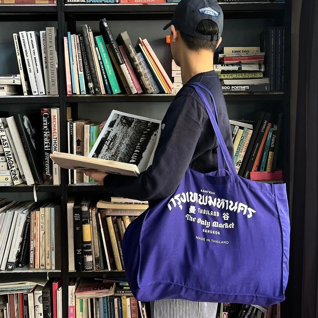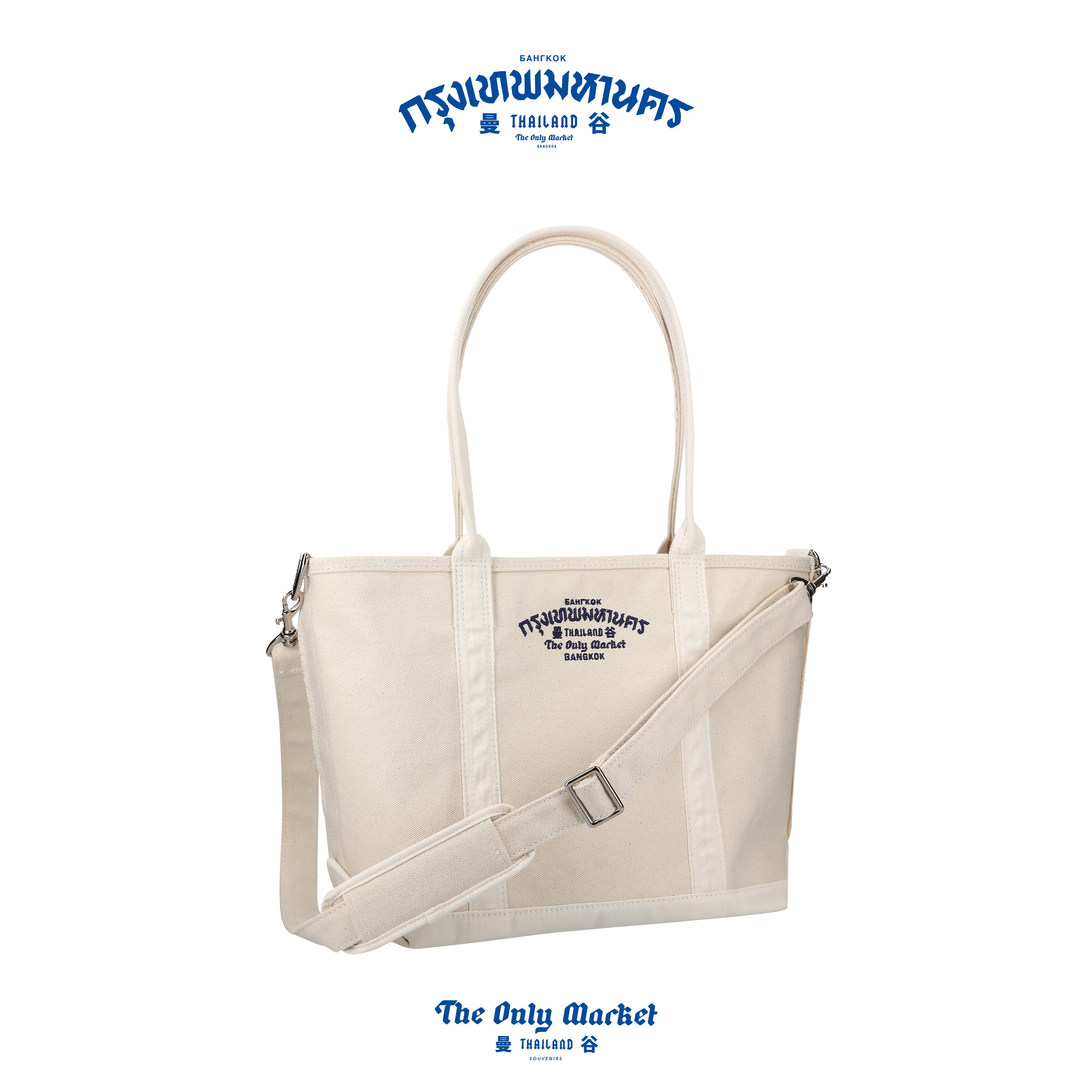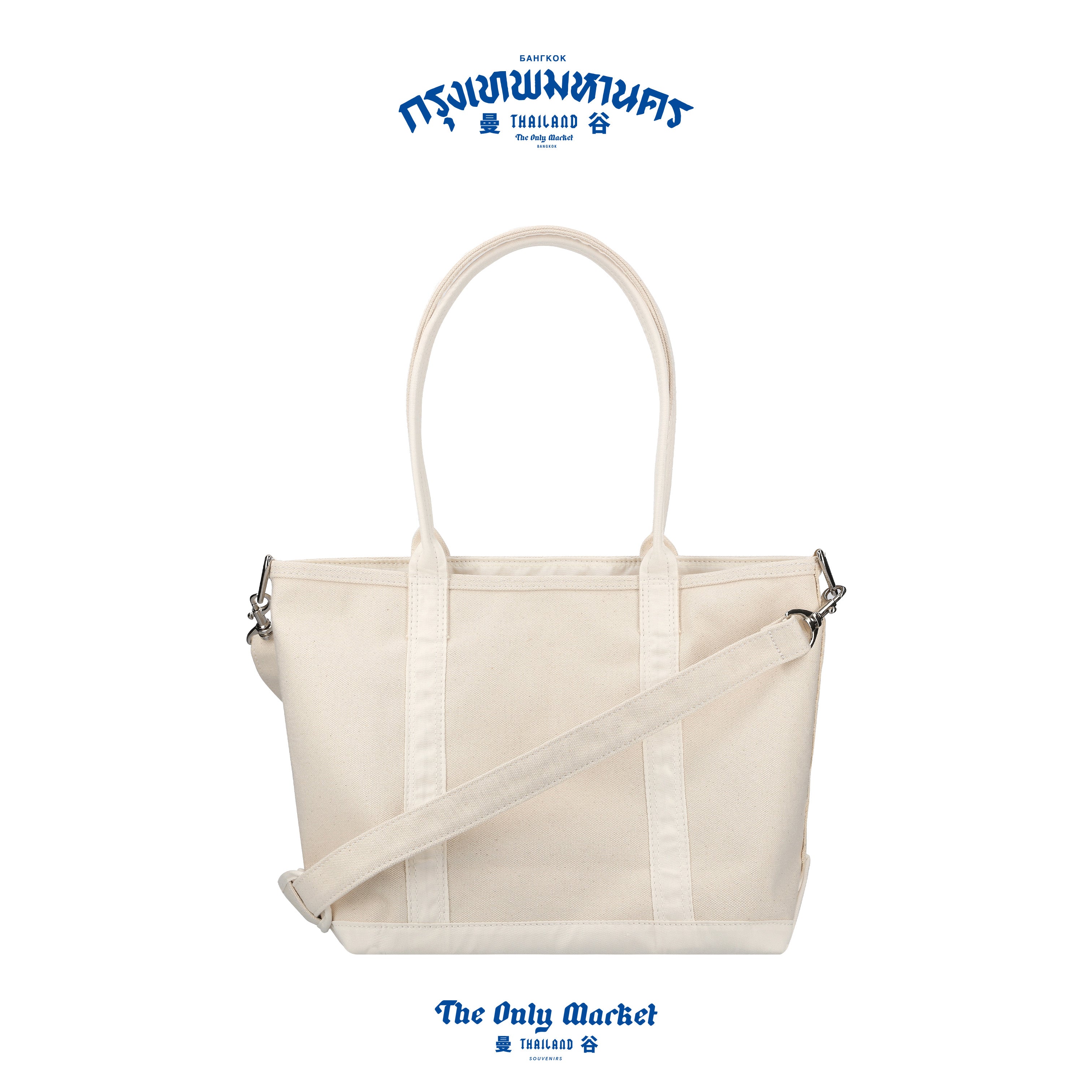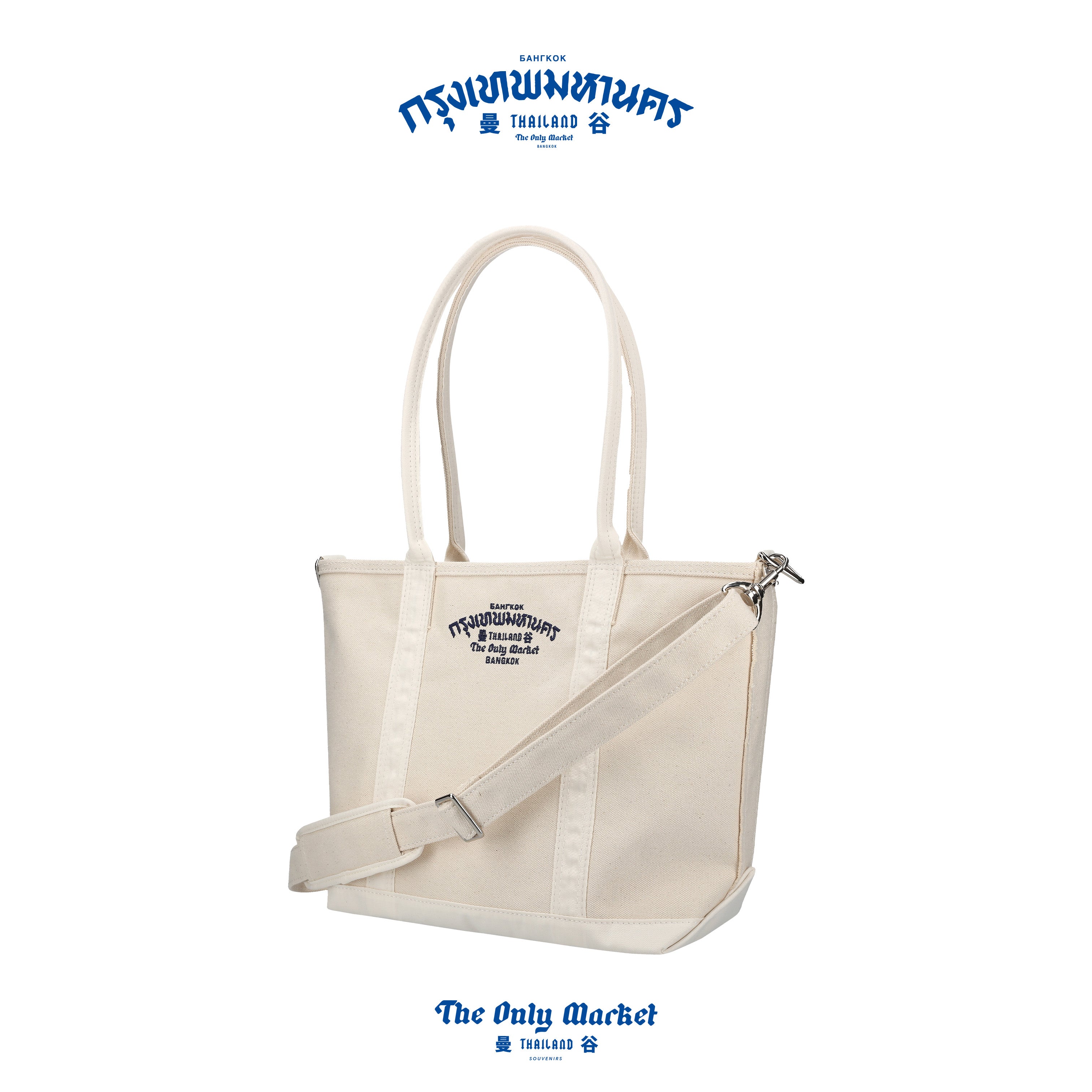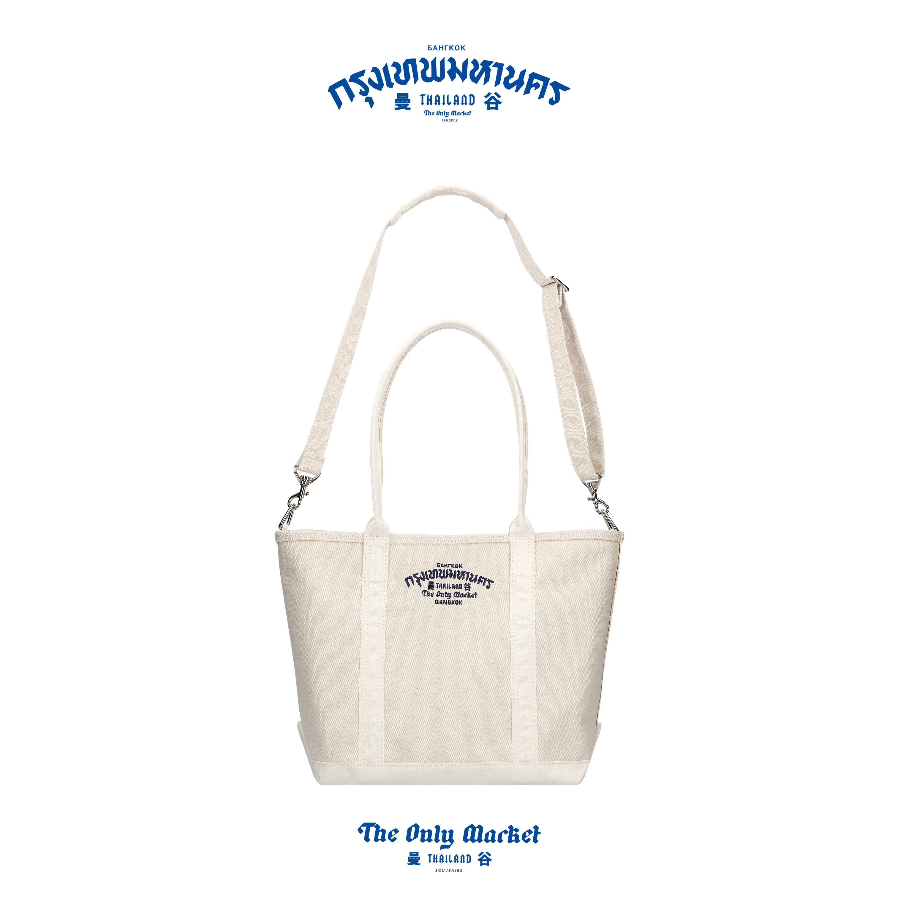 A brand new design from The Only Market Bangkok. This updated silhouette is made for everyday life. Crafted from durable canvas that holds its shape, featuring a detachable and adjustable strap to match your style. It’s your perfect go-to. Spacious enough to fit your laptop, tablet, water bottle, and all your daily essentials.