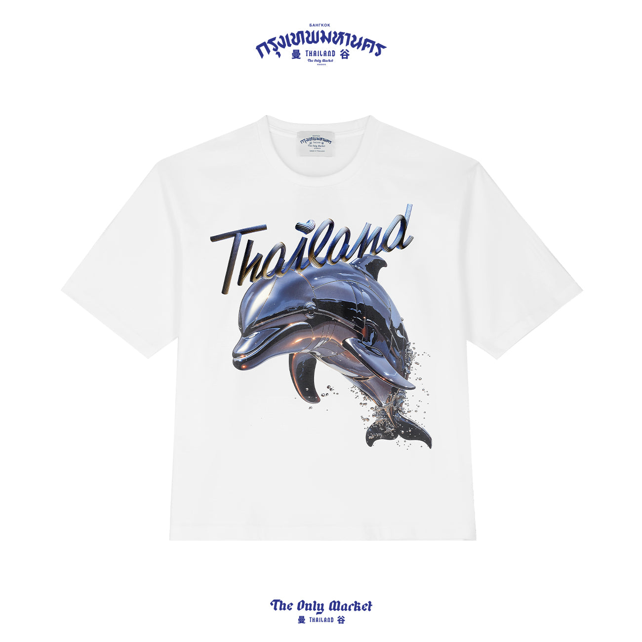 Oversized T-shirt with a dolphin design, a symbol of peace and freedom in Thailand’s sea. The dolphin is known for its charm and intelligence. The design expresses the dolphin’s movement with metallic colors that add a modern and stylish touch to the look.