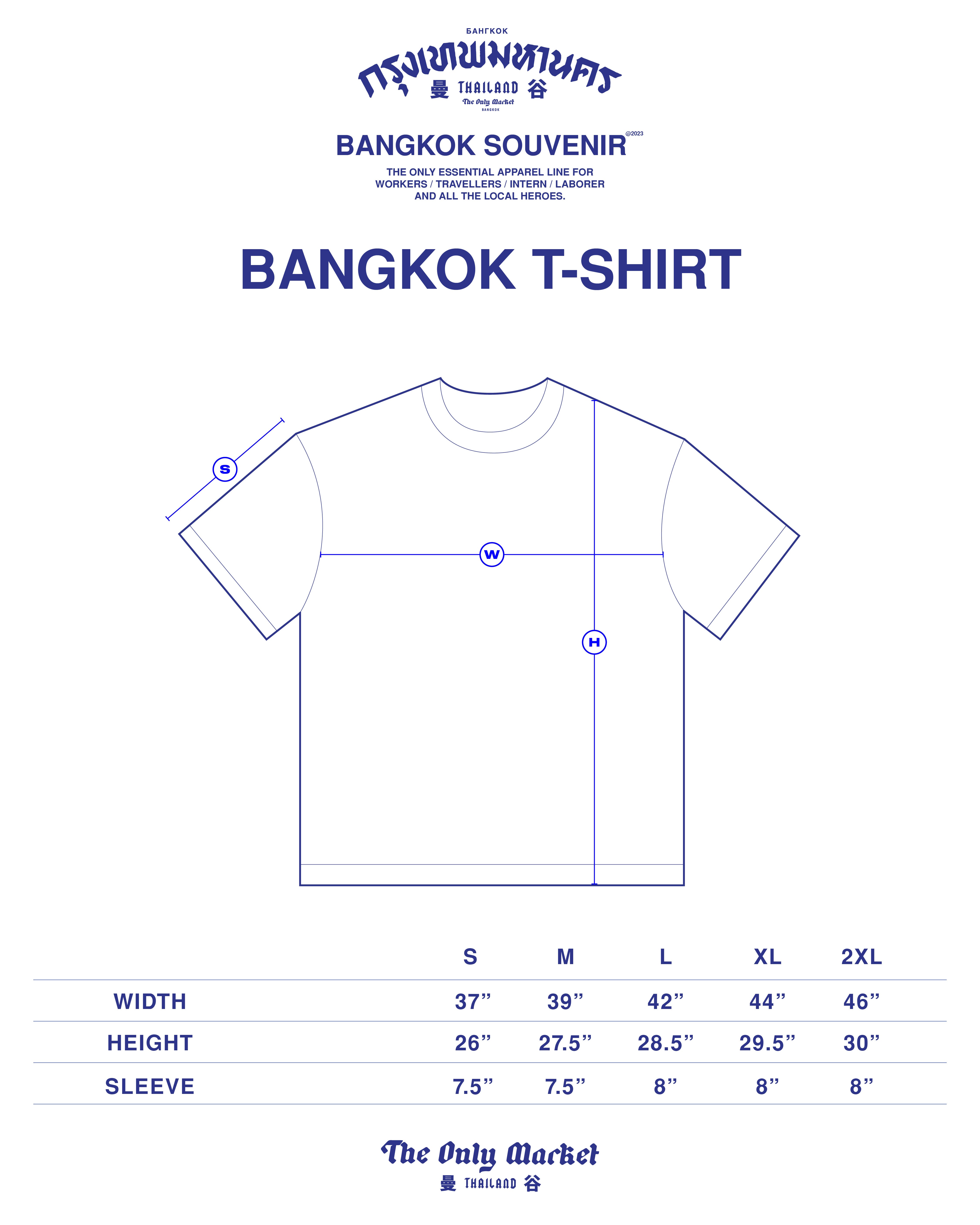 BANGKOK TEE เสื้อยืดสุดคลาสสิค สวยแบบไม่ต้องคิดเยอะ ใส่ได้ง่ายได้ทุกโอกาส มาพร้อมกับคุณภาพของเนื้อผ้าที่บาง นุ่ม และระบายอากาศได้ดี กับ 100% Cotton ที่จะให้ฟีลวินเทจนิดๆ เมื่อสวมใส่ ลายพิมพ์มีทั้งหมด 5 สี ได้แก่ ดำ, แดง, น้ำเงิน, เขียว, ส้ม