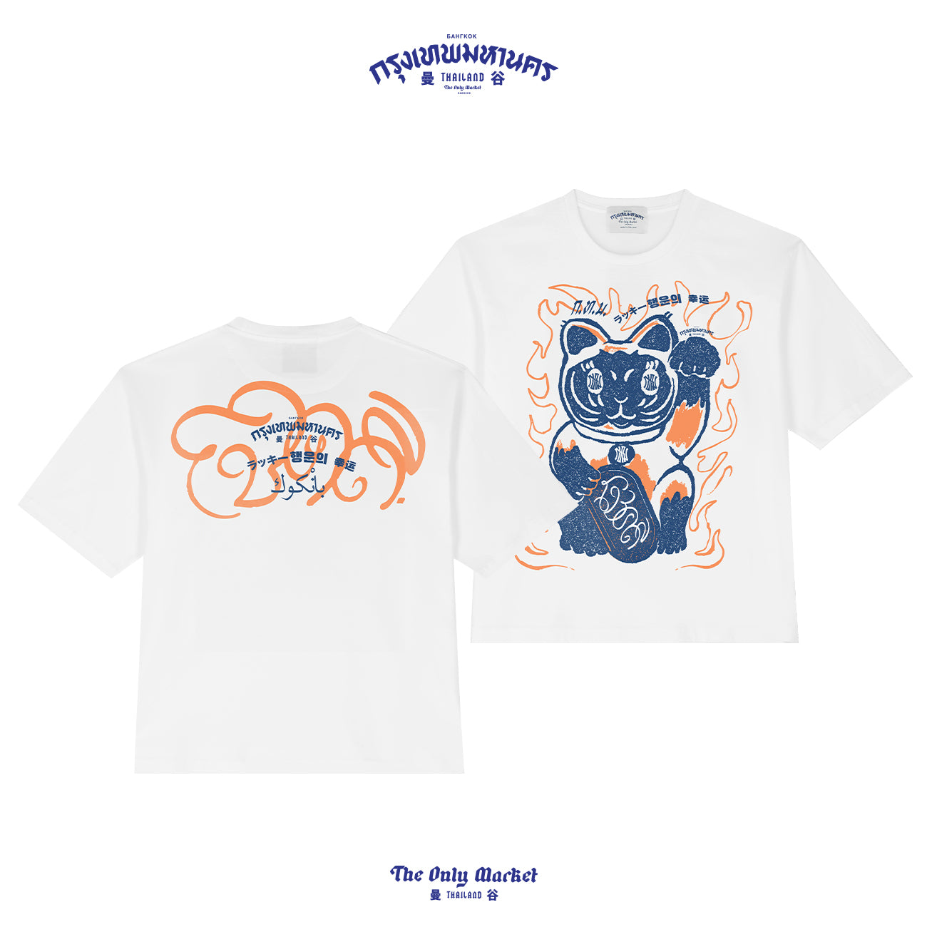 เสื้อยืดโอเวอร์ไซส์ลายแมวนำโชค แรงบันดาลใจจากนางกวัก หนึ่งในสัญลักษณ์แห่งความโชคดีและการเรียกทรัพย์ในความเชื่อไทย มีดีไซน์ผสมผสานความเป็นมงคลกับความน่ารัก ใส่ง่าย และเอกลักษณ์ ไอเท็มเสริมลุค พร้อมพกความเฮงติดตัวไปทุกที่