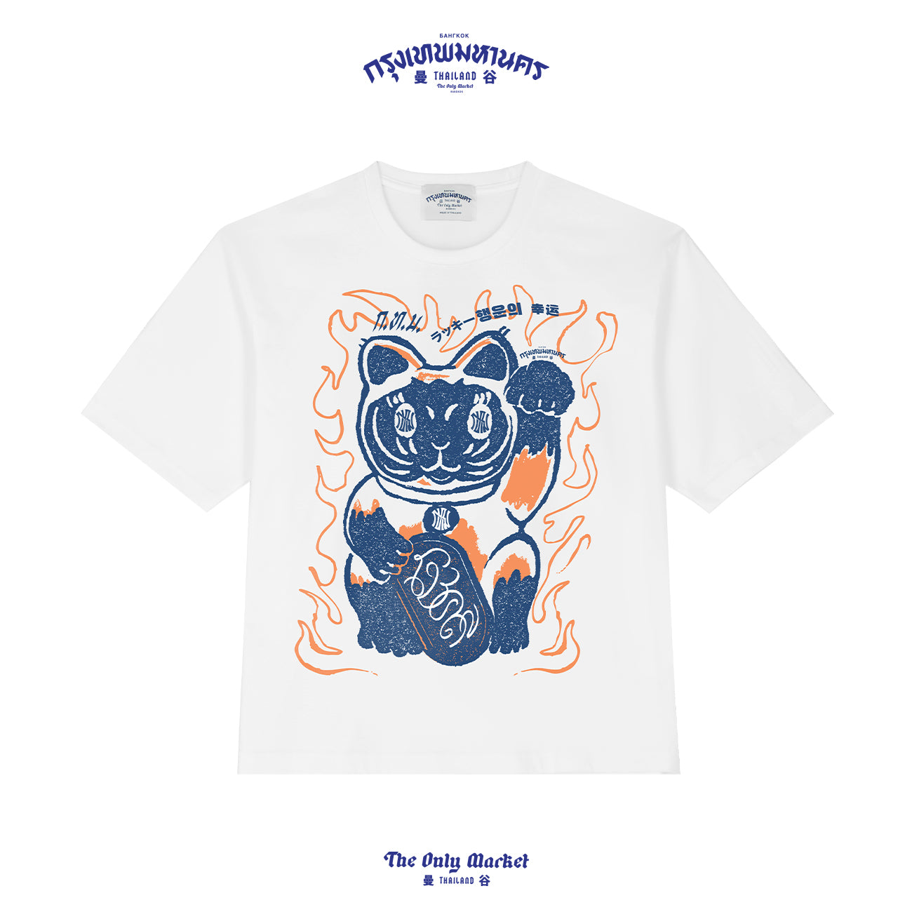 Oversized T-shirt featuring a Lucky cat design. Inspired by lucky cat, a traditional Thai symbol of luck and prosperity. This design blends auspicious charm with a playful touch, making it easy to wear and full of personality. A standout piece that brings good vibes with you, wherever you go.